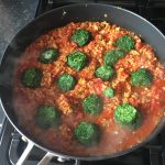 Heat a large frying or sauté pan on high (I cook everything in a high sided sauté pan), and add a few squirts of spray olive oil (prevents the sauce getting too greasy!)