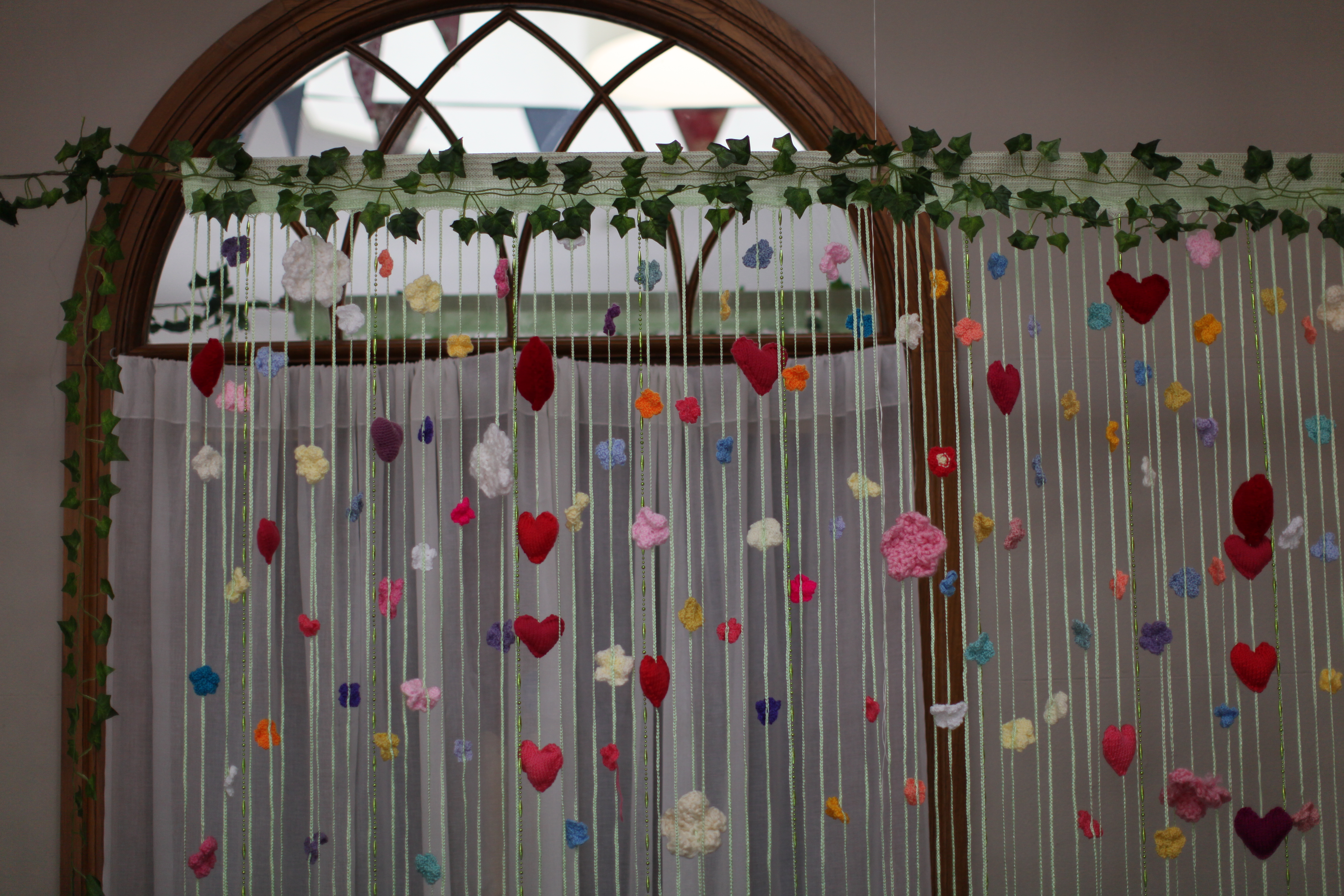 Over the course of nearly a year, and with the enlisted help of my family and friends we created knitted flower arrangements for the venues and church, including a massive floral arch for the church door; crocheted bouquets, buttonholes and corsages; paper floral arrangements; invitations, orders of service and menus; backdrops; bunting; staircase vines and a whole host of table decor and church decorations.